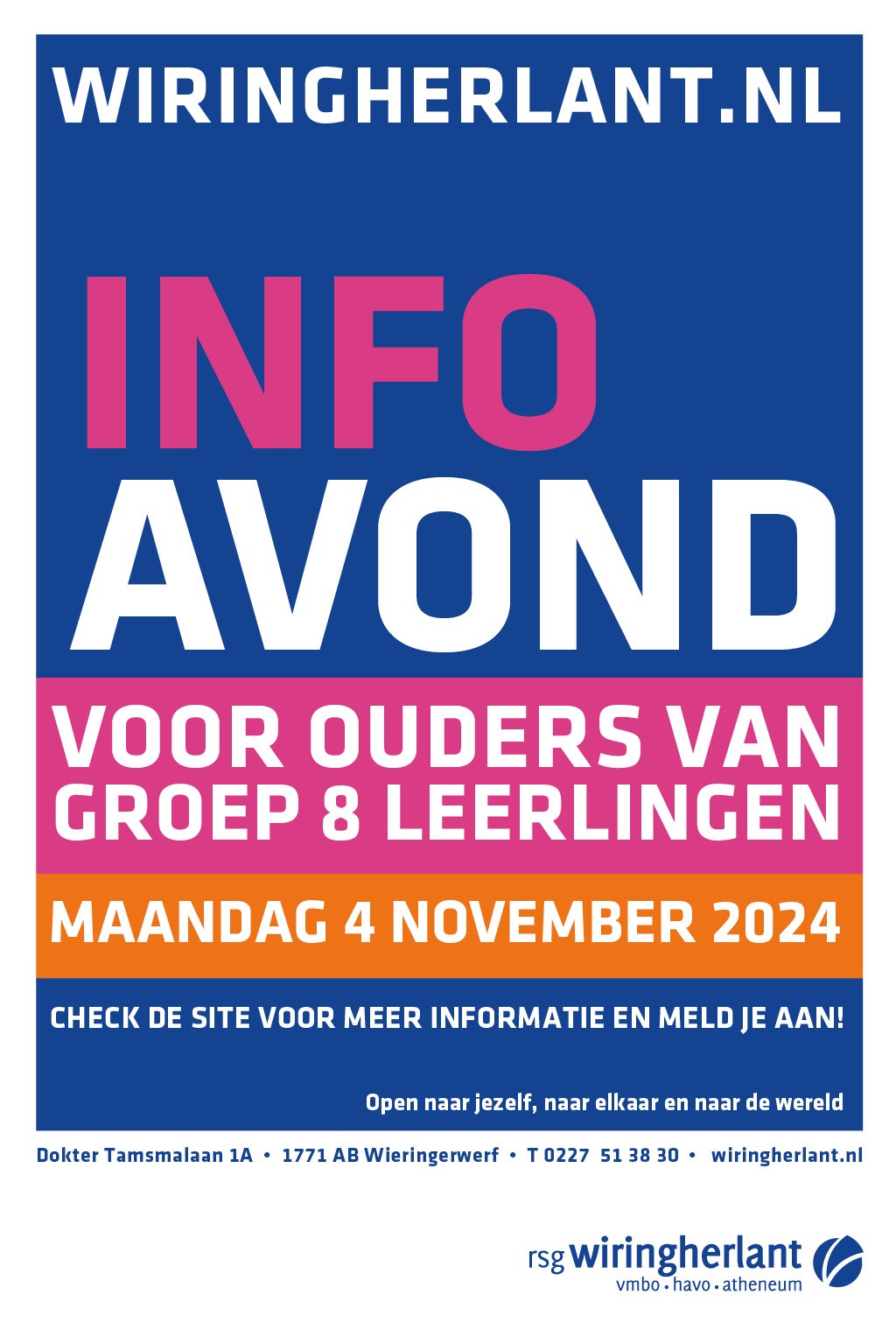 Op maandag 4 november is de voorlichtingsavond ‘van groep 8 naar de brugklas op Wiringherlant’. Wij nodigen u van harte uit.